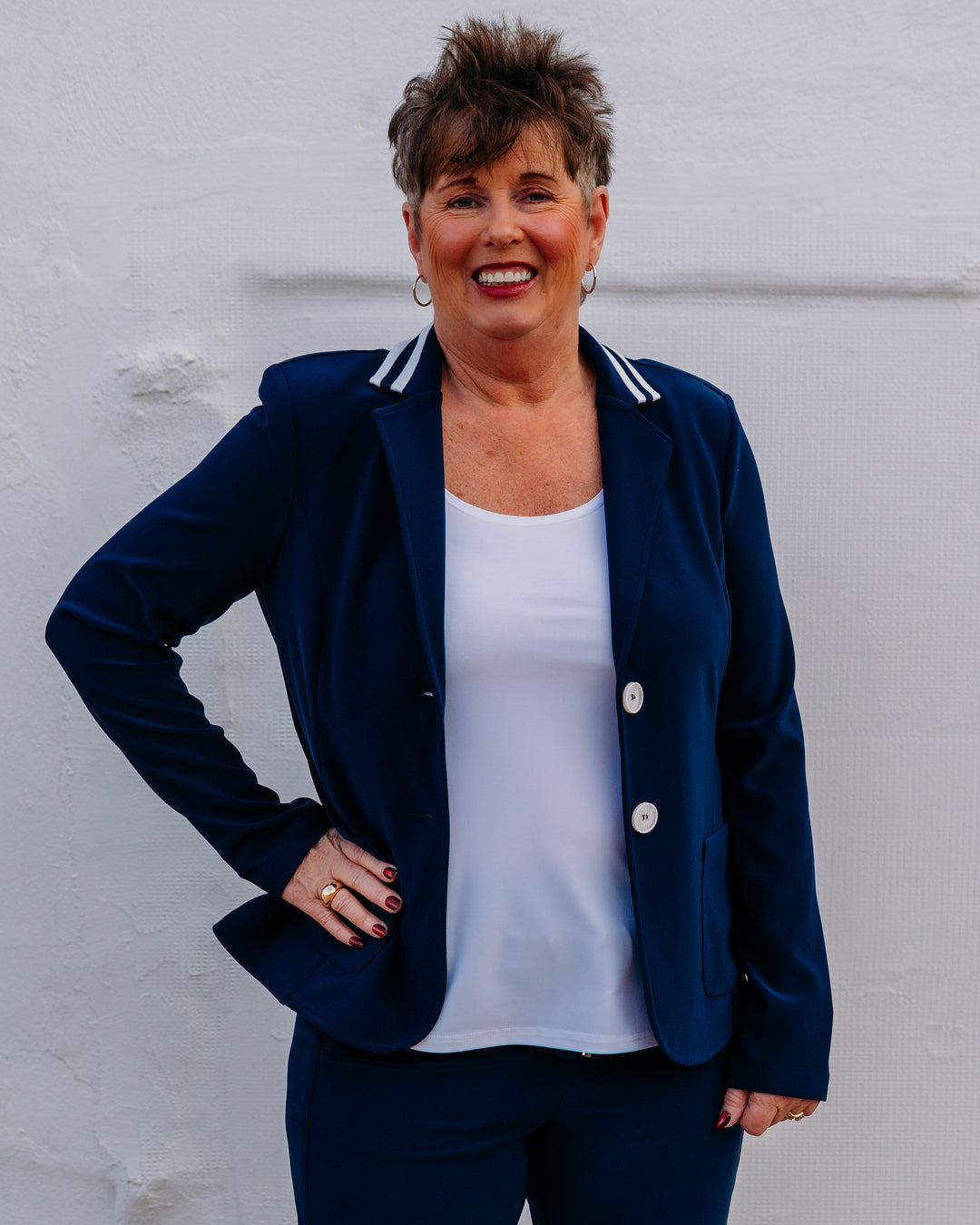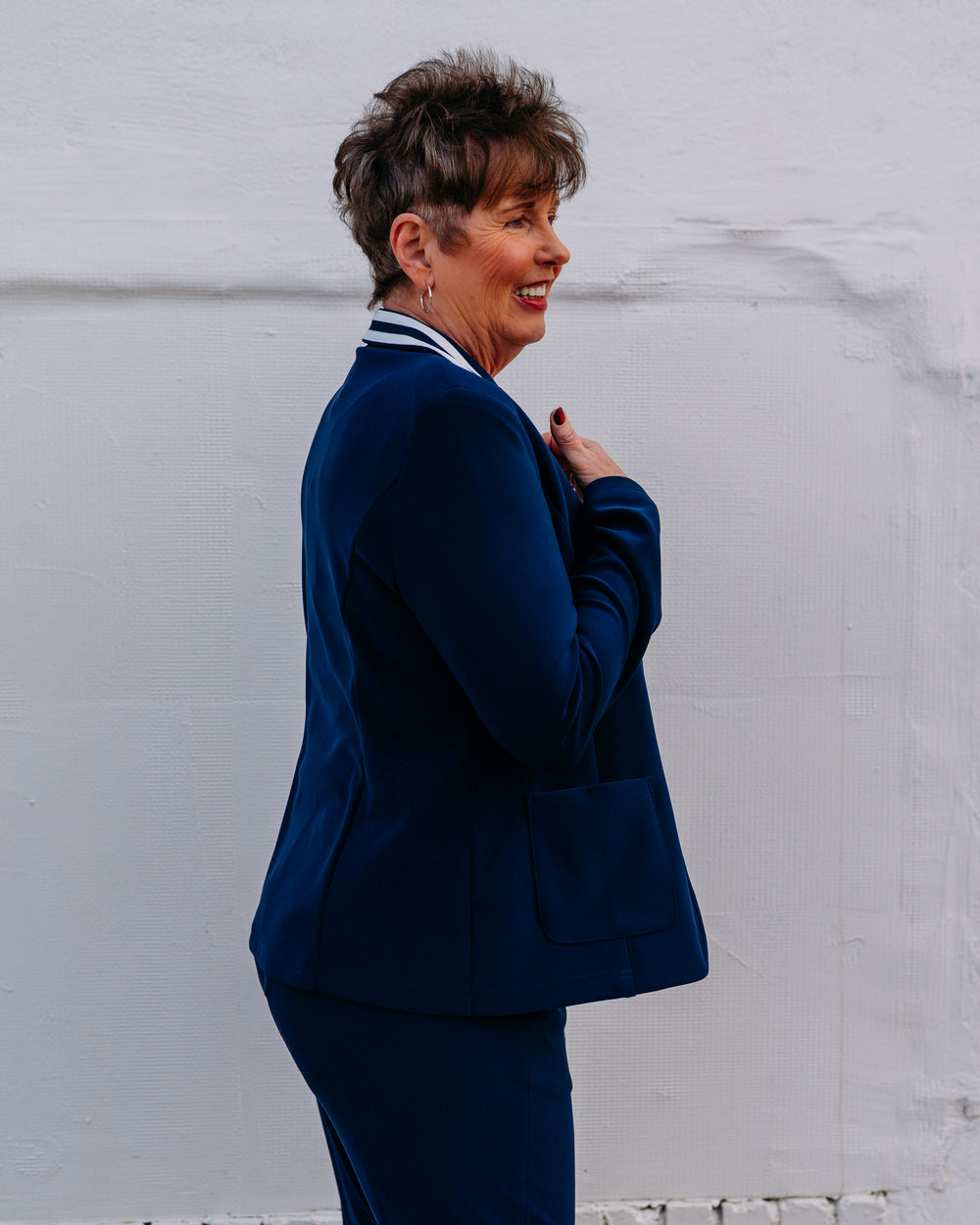 Joseph Ribkoff:Silky Knit Fitted Blazer With Stripe Band Detail in Navy (261622)