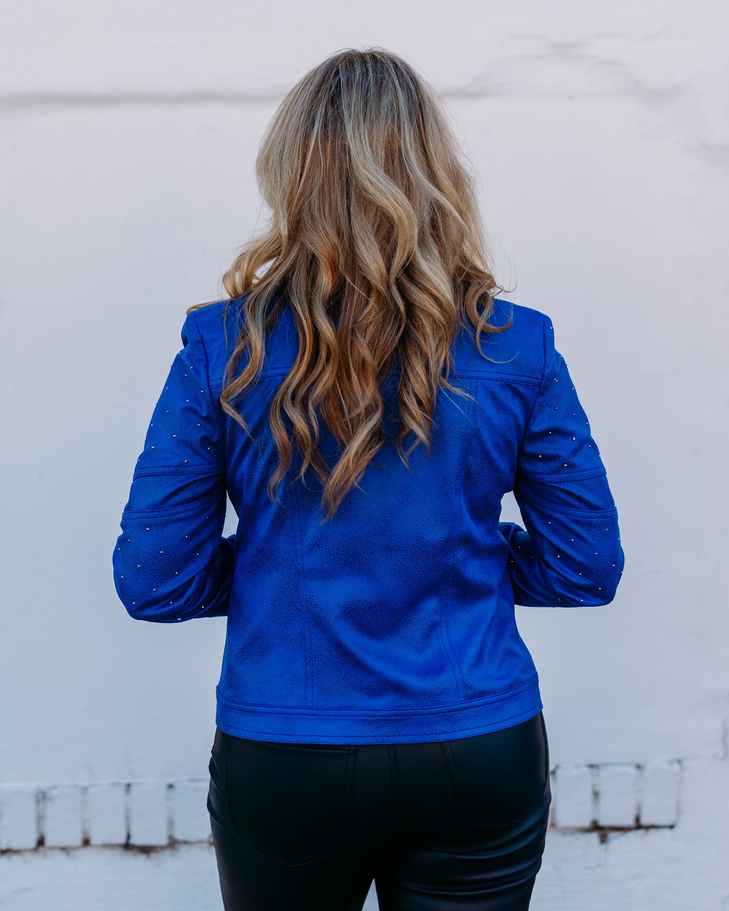 Joseph Ribkoff: Foiled Faux Suede Fitted Jacket with Rhinestones in Royal Sapphire