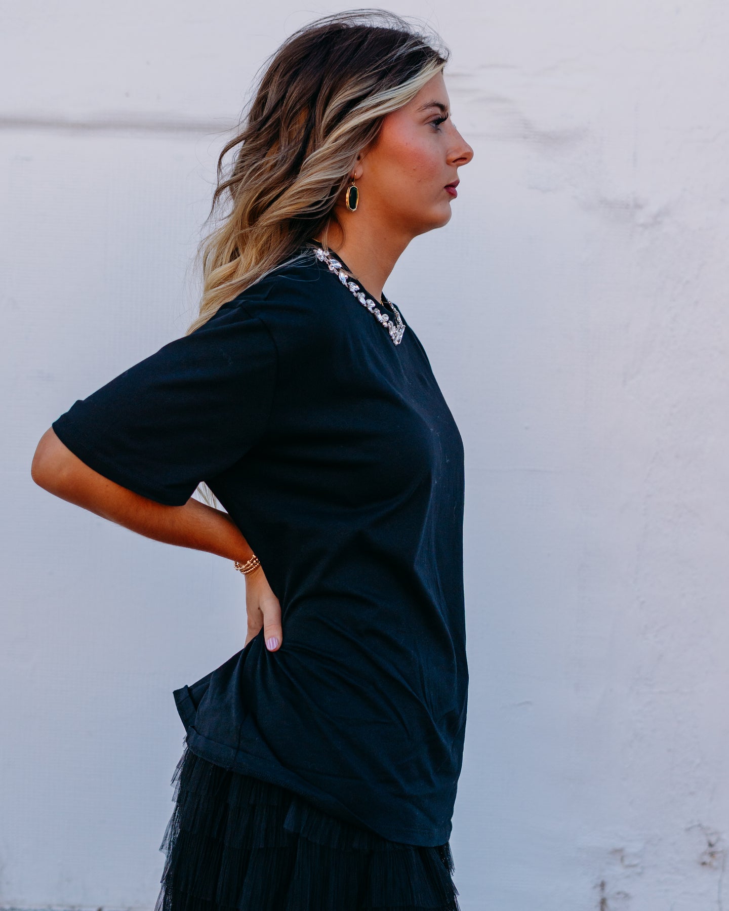 Add a touch of sparkle to your casual look with the Elan Black Rhinestone Collar Tee. This playful tee features a chic rhinestone-studded collar that effortlessly elevates your everyday style. Perfect for pairing with jeans or skirts, it brings a fun and fashionable twist to your wardrobe essentials.