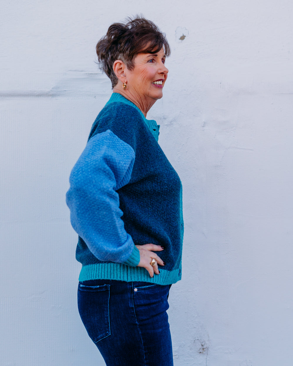 Tribal: Button Front Color Block Cardigan in Opal Green