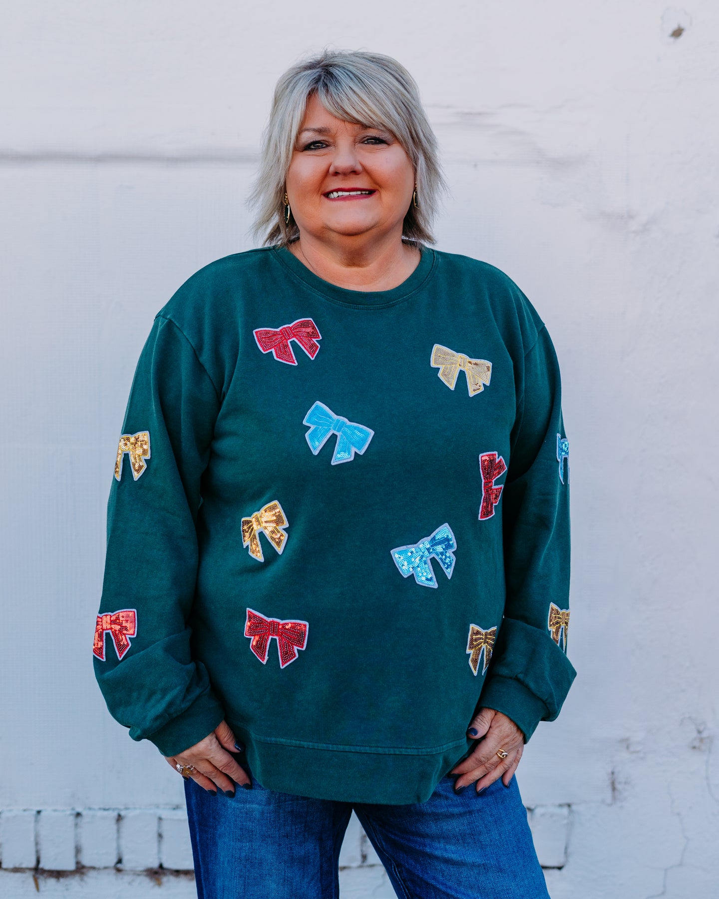 Make a statement with this hunter green sweatshirt that's anything but ordinary. The eye-catching sequin bow detail adds a touch of sparkle and personality, perfect for elevating your everyday look. Crafted by Jodifl, this piece balances comfort with style—ideal for casual outings or dressing up your weekend wardrobe. The rich hunter green hue pairs effortlessly with your favorite jeans or layered pieces, making it a versatile addition to any closet.