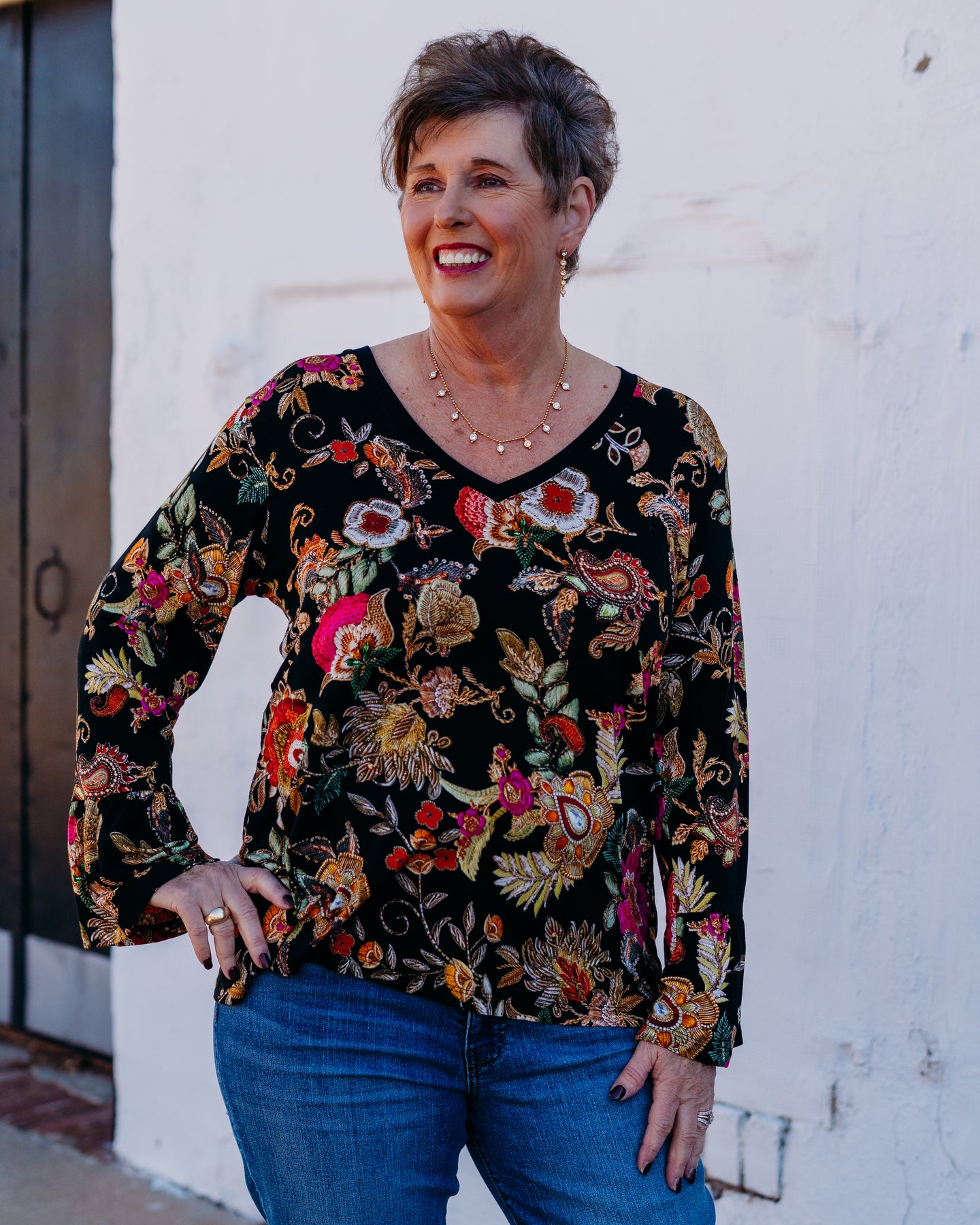Johnny Was: The Janie Favorite V-Neck Flute Sleeve Tee in Lowri Black