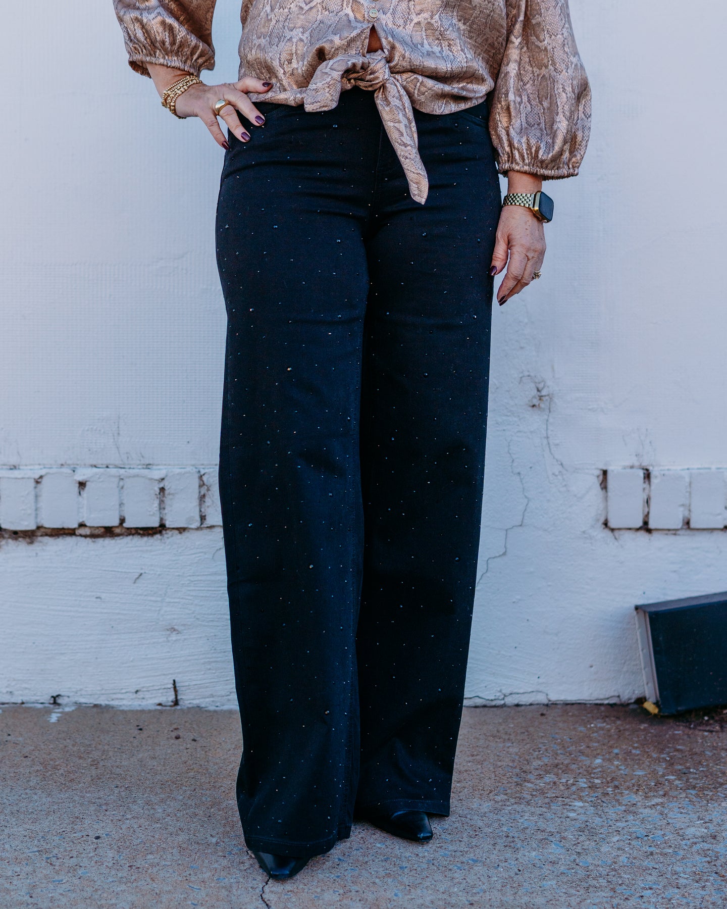 Elevate your denim game with these stunning Joseph Ribkoff wide-leg jeans that blend timeless style with a touch of sparkle. The classic silhouette flatters every frame, while delicate rhinestone accents add just the right amount of glamour to your everyday look. Perfect for dressing up or down, these jeans are your new go-to for effortless sophistication with personality. Crafted for comfort and designed to turn heads, they're the versatile piece every wardrobe deserves.