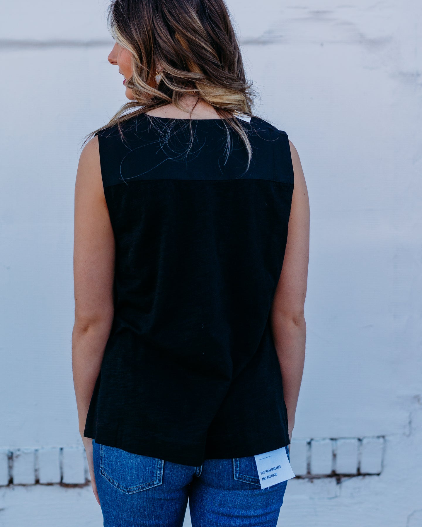 Liverpool: Sleeveless V-Neck Woven-To-Knit Top in Black (LM8K27PS6)