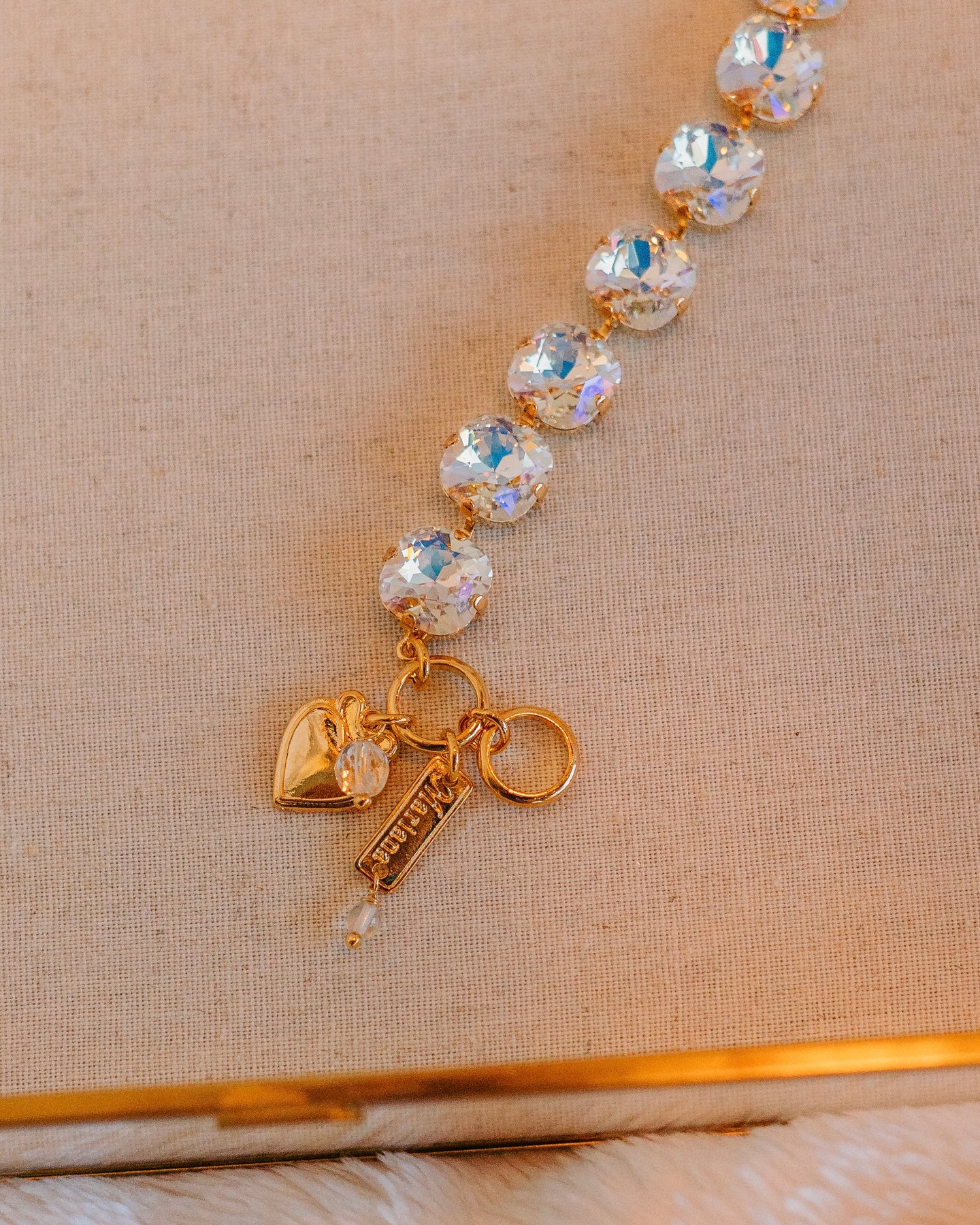 Elevate your everyday sparkle with the Mariana bracelet, a playful take on timeless elegance. Featuring crystal-clear studs set against warm gold tones, this piece strikes the perfect balance between understated sophistication and eye-catching glamour. Whether you're dressing up for a night out or adding a touch of shine to your casual look, this bracelet brings just the right amount of dazzle to any wrist. A versatile essential that works as hard as you do.