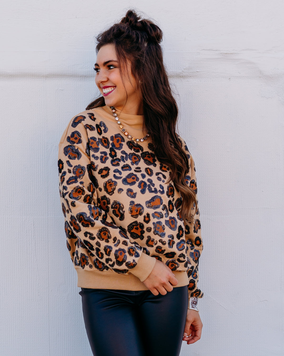 Queen of Sparkles: Tan, Brown, & Black Leopard Mock Neck Sweatshirt