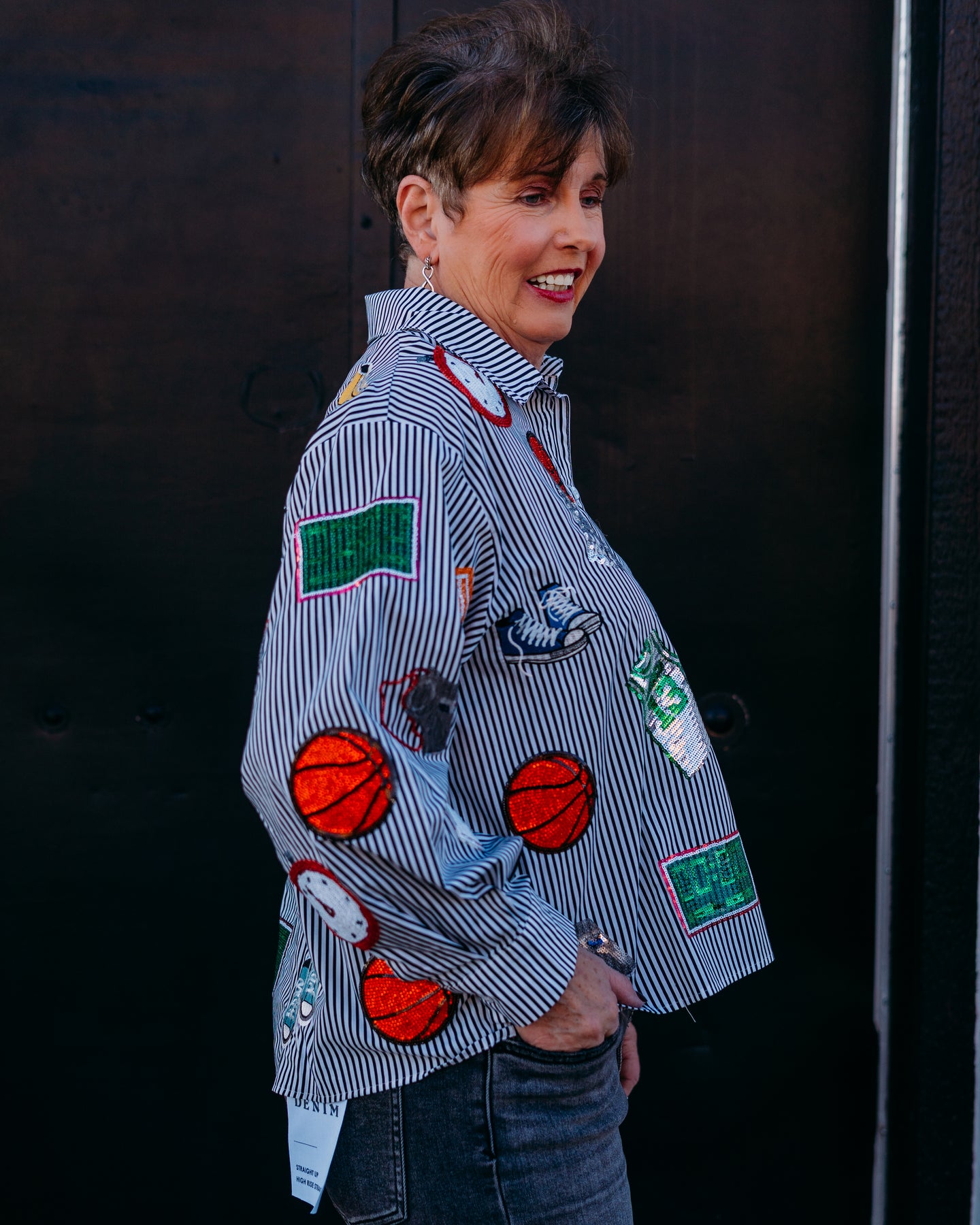 Step onto the court of style with the Queen of Sparkles Basketball Icon Button-Up in Black! This playful shirt combines sporty vibes with a touch of glam, perfect for those who love to shine while keeping it casual. Its sleek black design makes it easy to pair with your favorite jeans or shorts, letting you score fashion points effortlessly. Whether you're cheering from the sidelines or out with friends, this button-up adds a fun, sparkling twist to your everyday look.