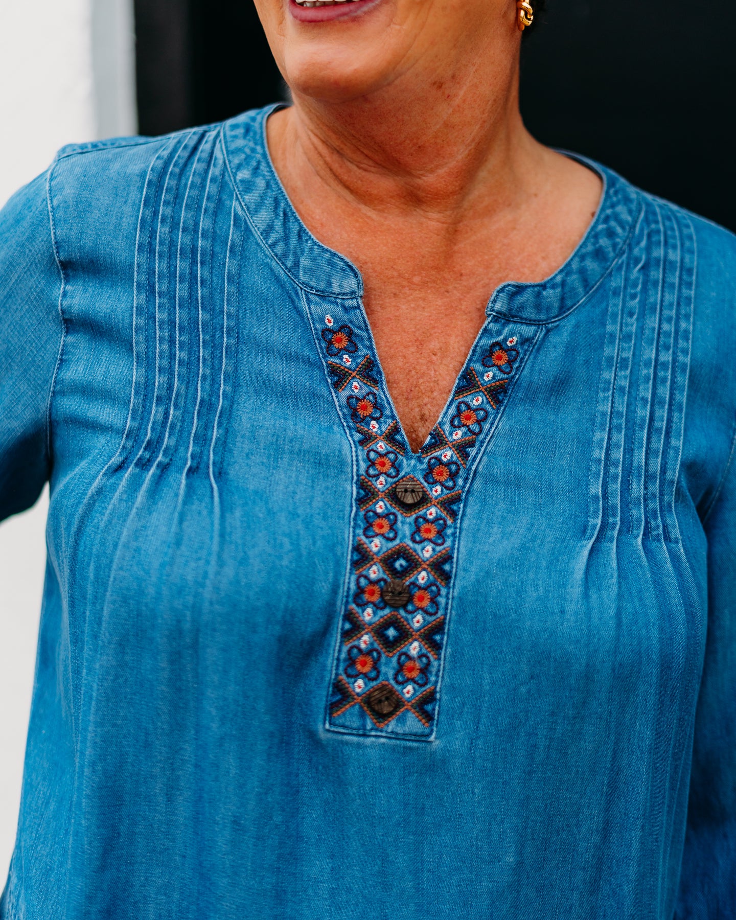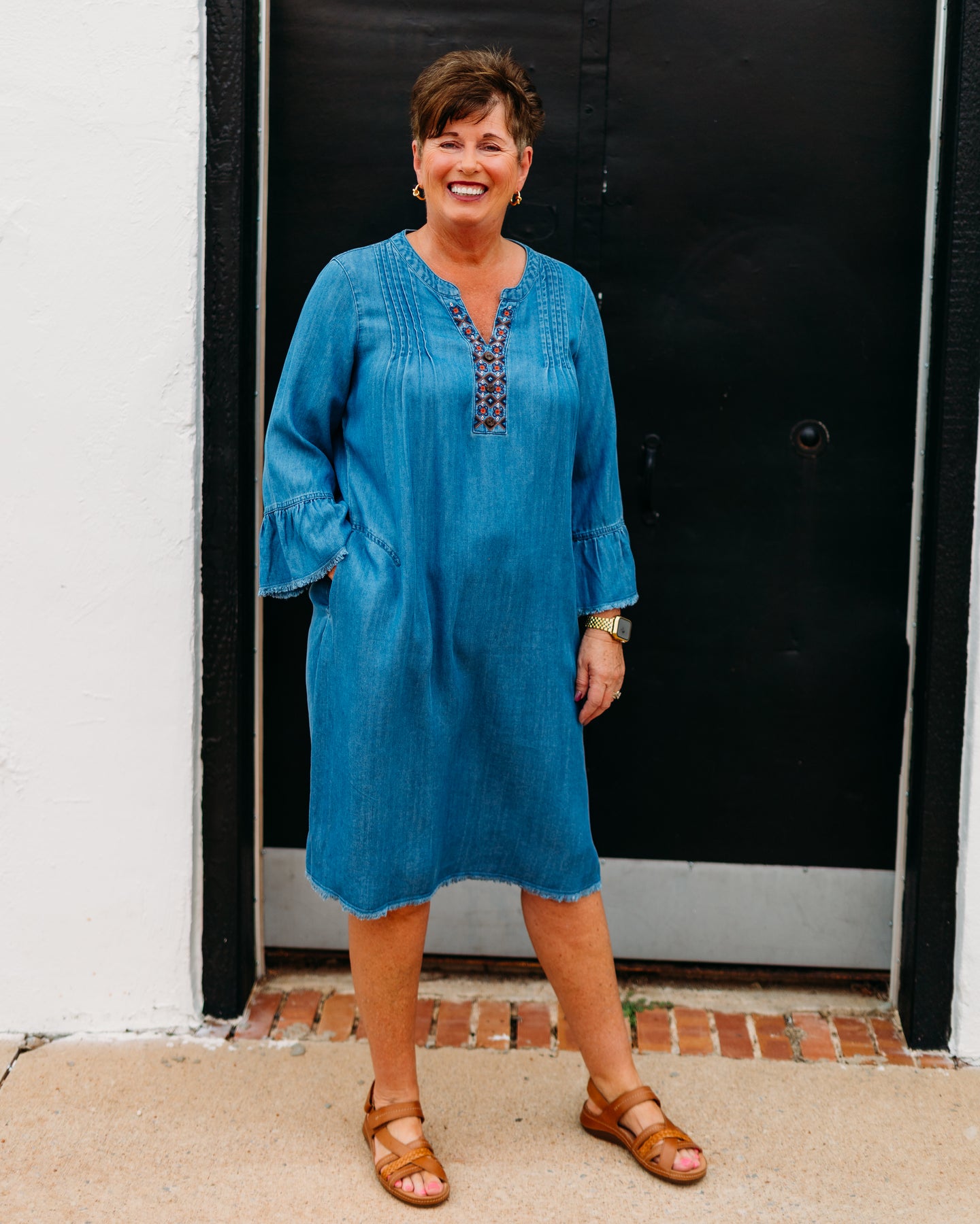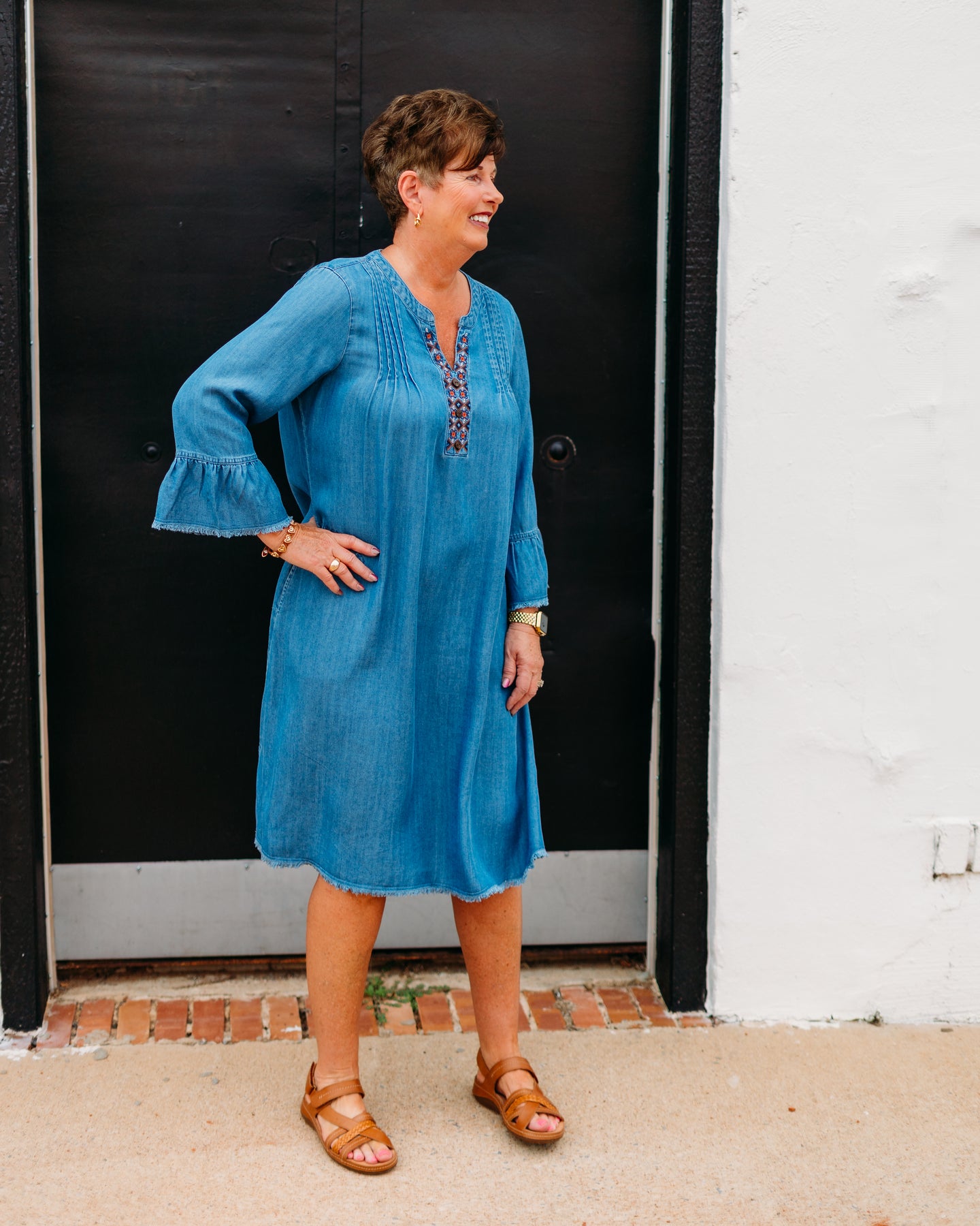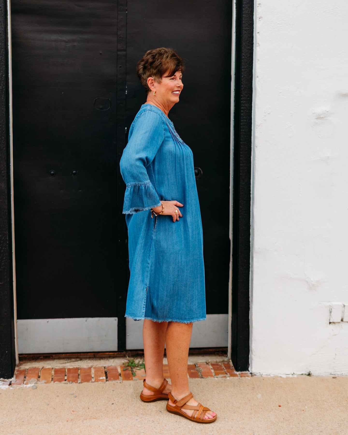 Channel your inner fashionista with our Multiples flounce sleeve dress! The band collar, notch neck, and multi tuck design create a unique and stylish look. Plus, the 3/4 sleeves add a touch of femininity. Elevate your wardrobe with this must-have piece.