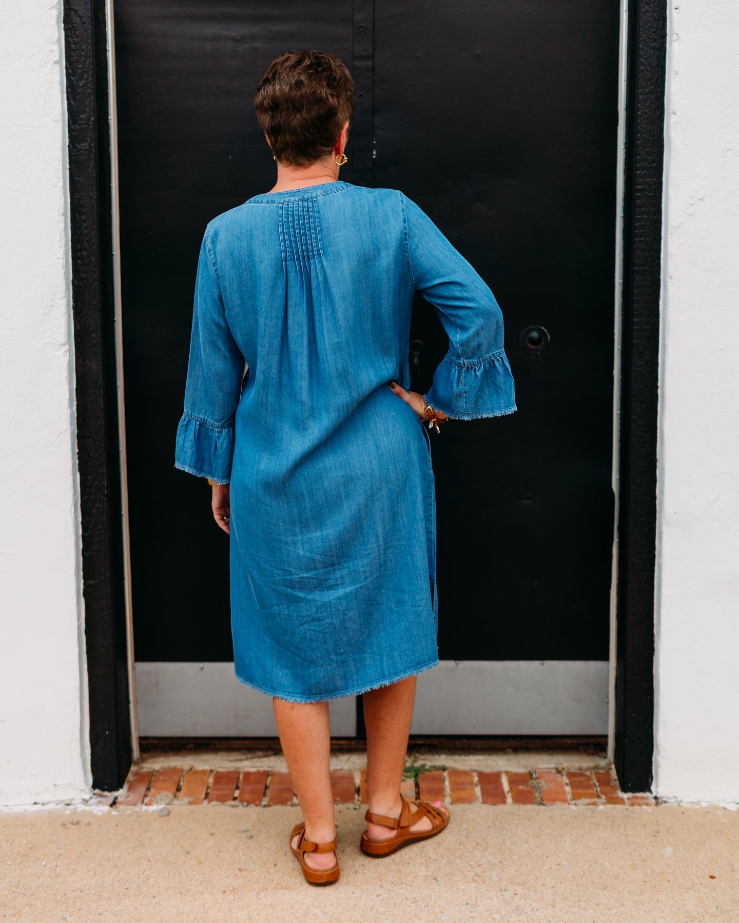 Multiples: 3/4 Flounce Sleeve Band Collar Notch Neck Multi Tuck Dress (M35506DM)