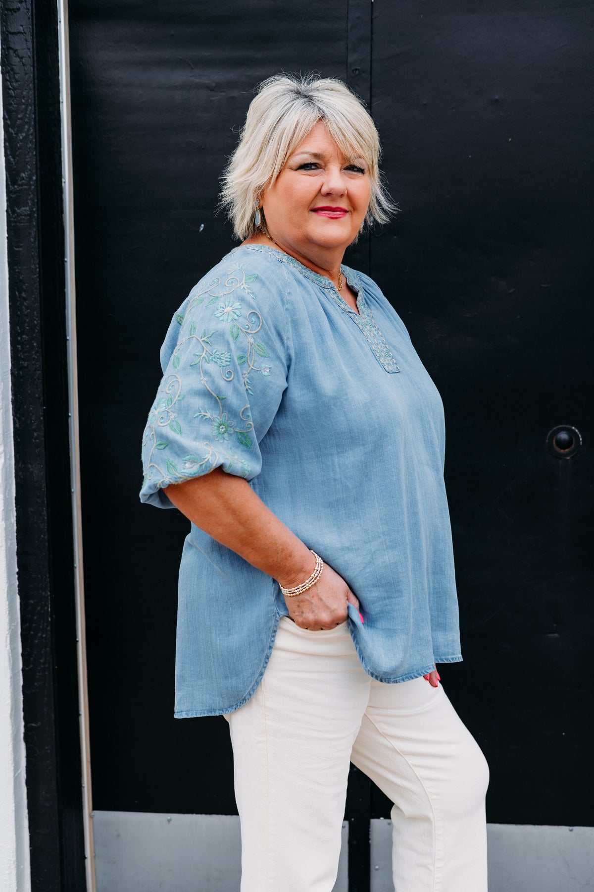 Introducing the Multiples Elbow Raglan Sleeve with charming embroidery. This top combines style and comfort, making it perfect for any occasion. Be unique and have fun with this quirky addition to your wardrobe.