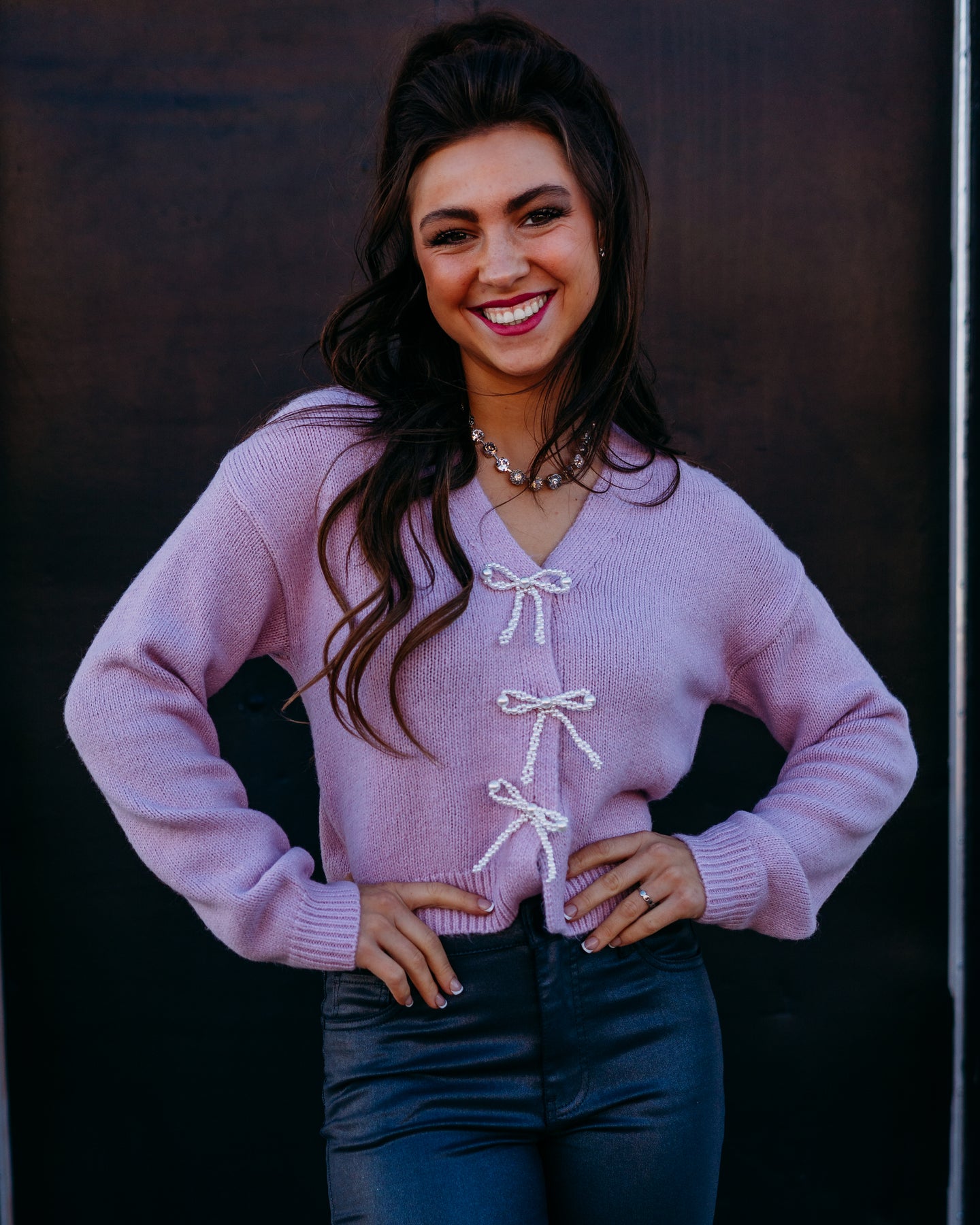 Add a touch of whimsy to your wardrobe with the V-Neck Gem Bow Cardi in Lilac Snow. This charming cardigan features a delicate bow and sparkling gem accents that brighten up any outfit. Its soft lilac hue brings a fresh, playful vibe perfect for layering on cooler days. Cozy, cute, and effortlessly stylish—this cardi is your new go-to for fun, flirty fashion.