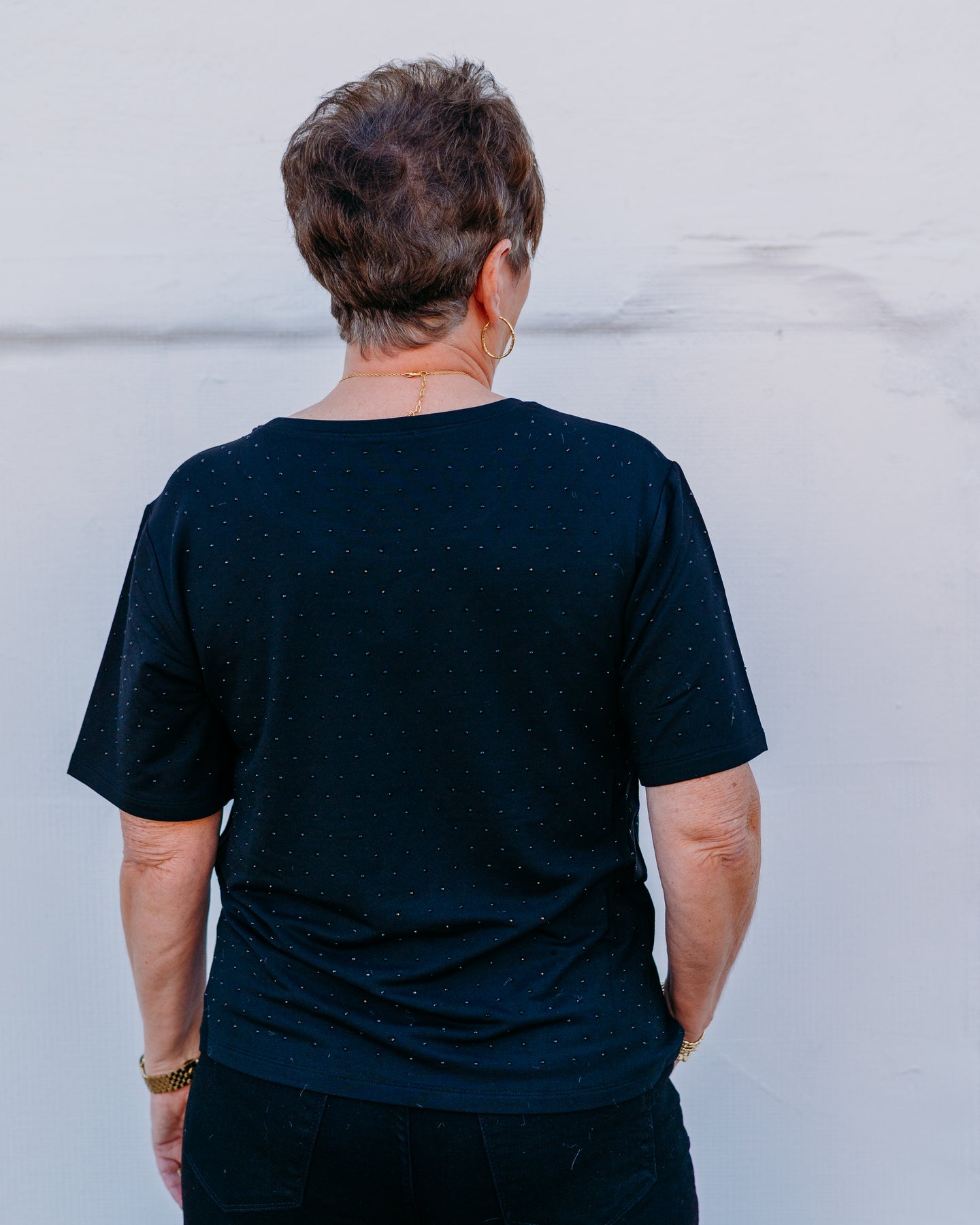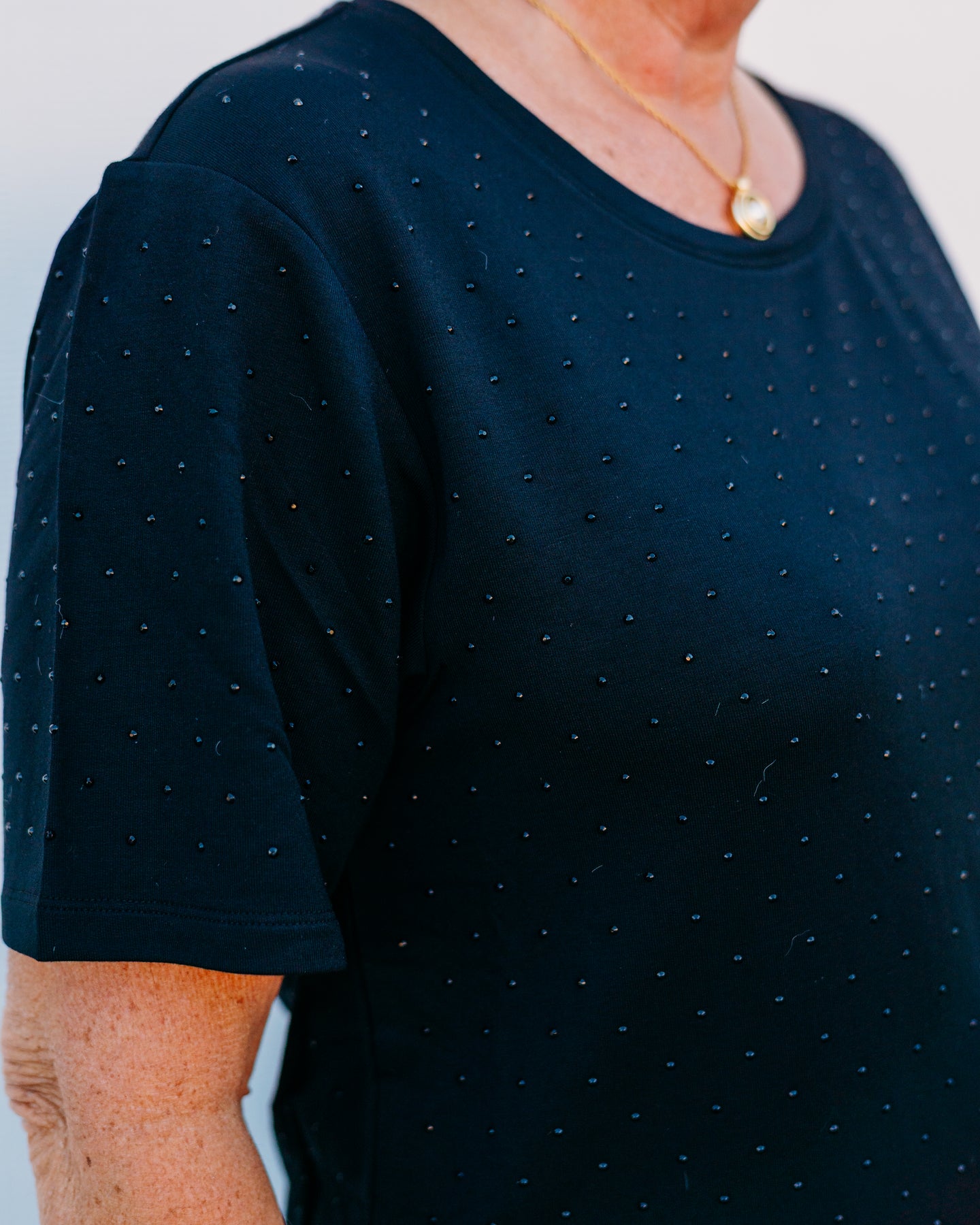 Add a touch of sparkle to your everyday wardrobe with this three-quarter sleeve t-shirt, featuring all-over rhinestones and a flattering straight silhouette.