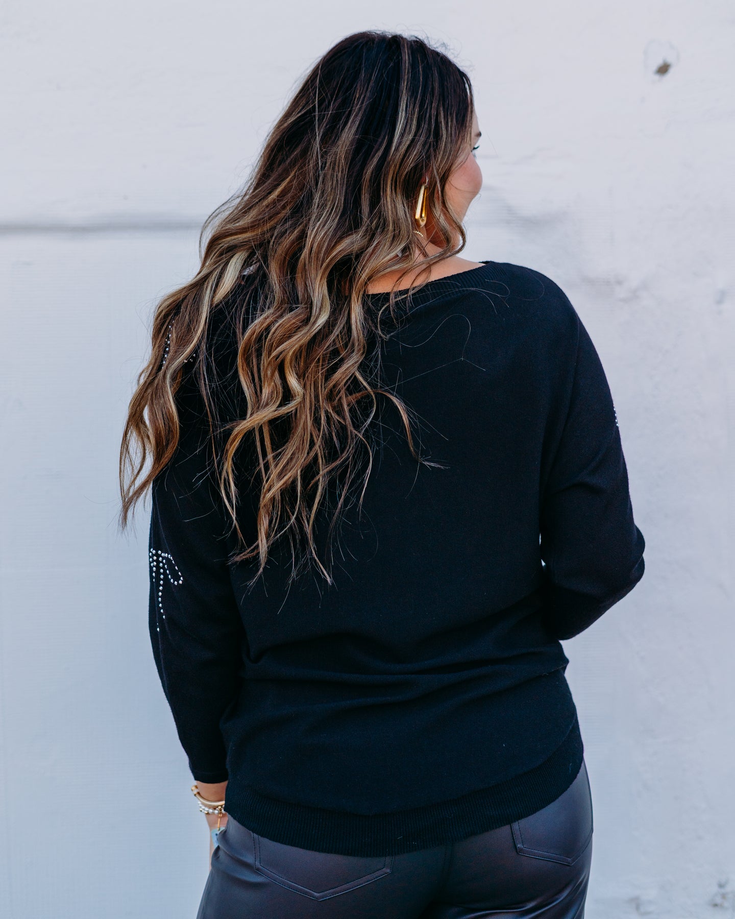 Delicate bow details add a stylish twist to this cozy sweater knit pullover. Framed by a flattering boat neckline, three-quarter sleeves, and a chic high-low hem, this charming piece blends comfort with elegance.