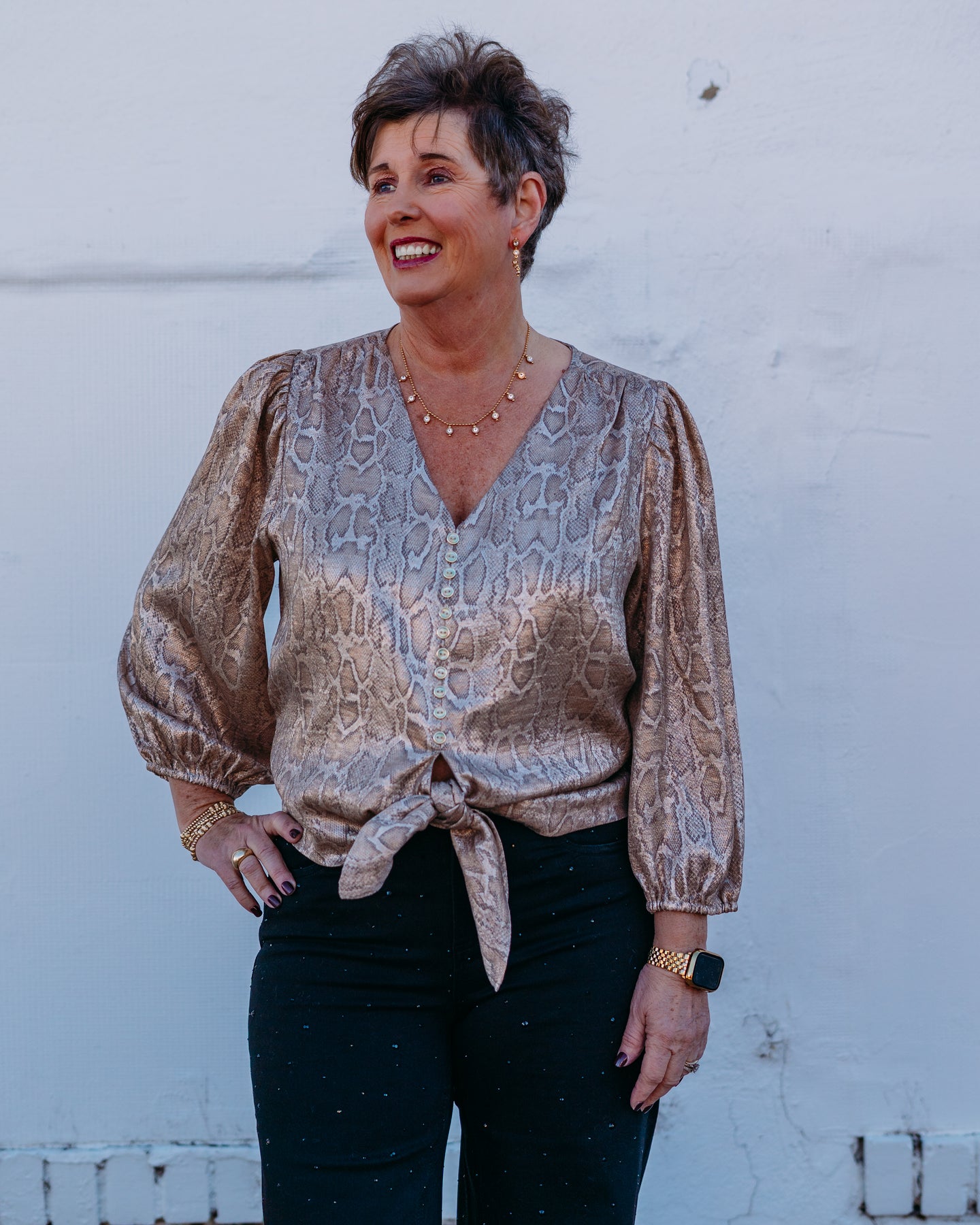 Add a splash of wild charm to your wardrobe with the Joy Joy Python Tie Top in Gold. This playful piece features a striking python print and a trendy tie-front design, perfect for turning heads and expressing your bold style. Lightweight and flattering, it pairs effortlessly with your favorite jeans or skirts for a look that’s both fun and fierce.