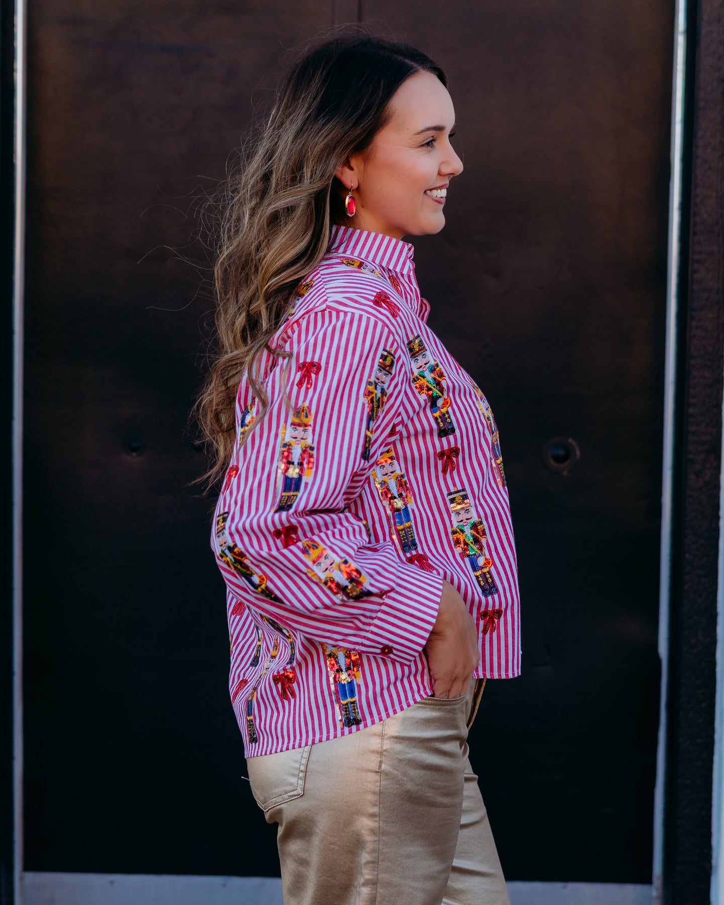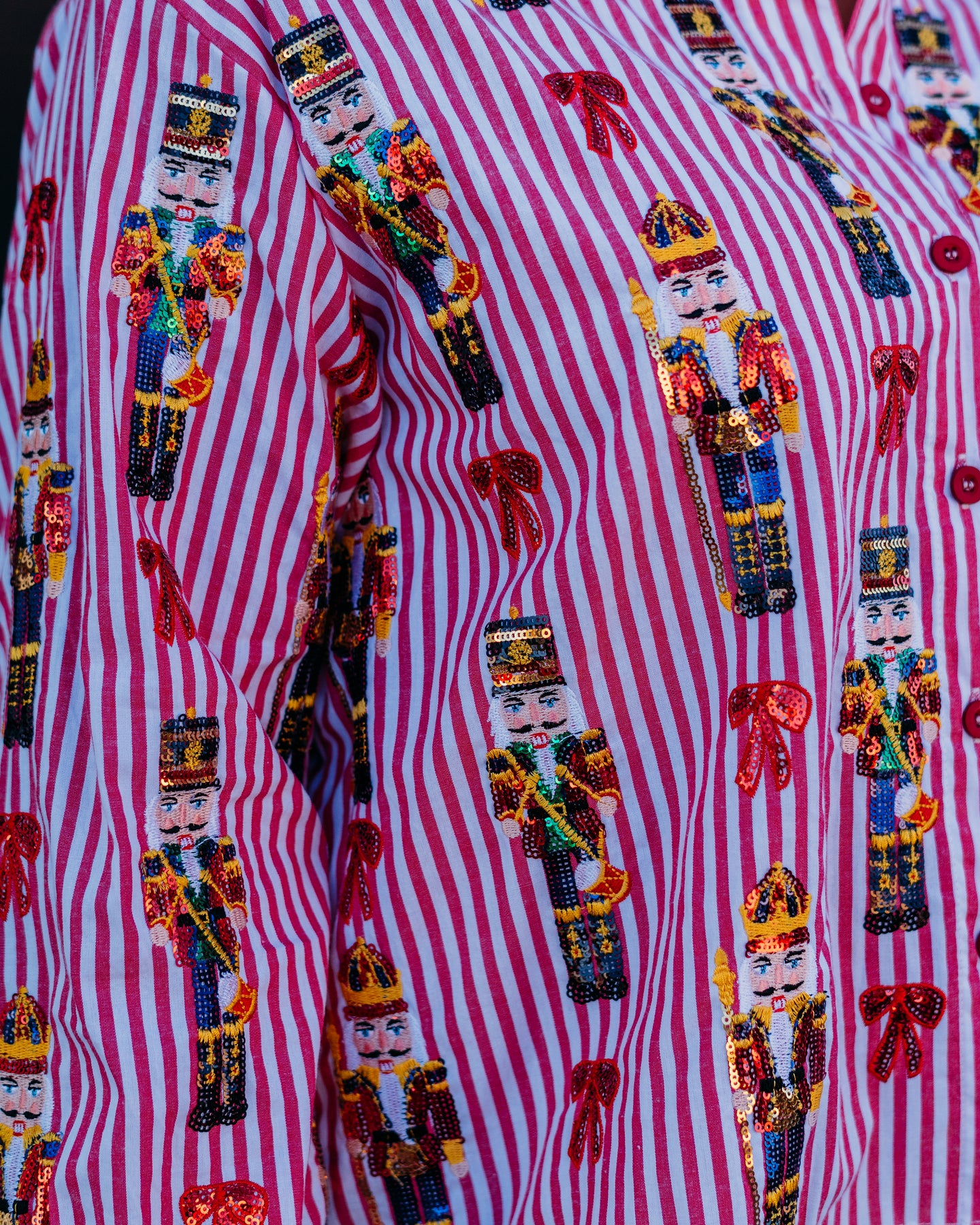 Queen Of Sparkles: Red Stripe Scattered Nutcracker & Bow Cotton Button Up Top