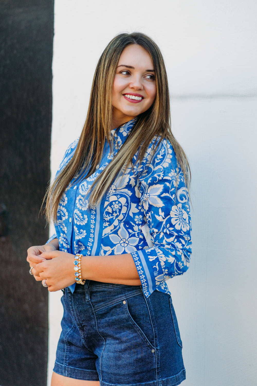 Karen Kane: Ruched Sleeve Shirt in Floral Paisley Print