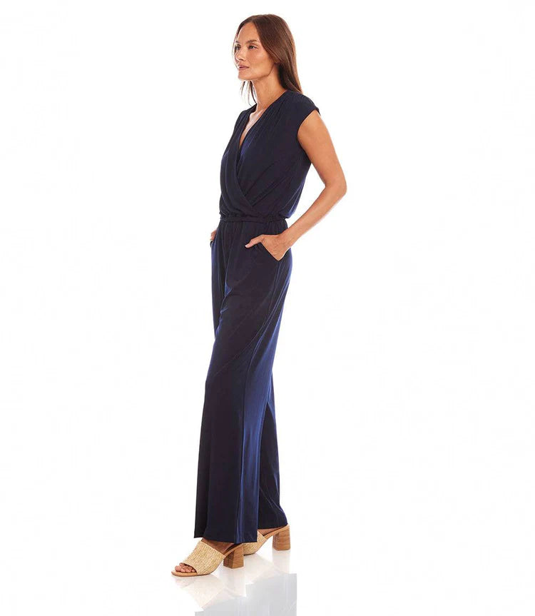 Elevate your travel style with the Karen Kane Sleeveless Travel Jersey Jumpsuit in Navy. Crafted from soft, breathable jersey fabric, this jumpsuit moves with you, keeping comfort front and center whether you're jet-setting or just out and about. Its sleek, sleeveless design adds a playful touch, making it easy to layer or wear solo. Effortlessly chic and ready for any adventure, this jumpsuit turns every trip into a stylish journey.