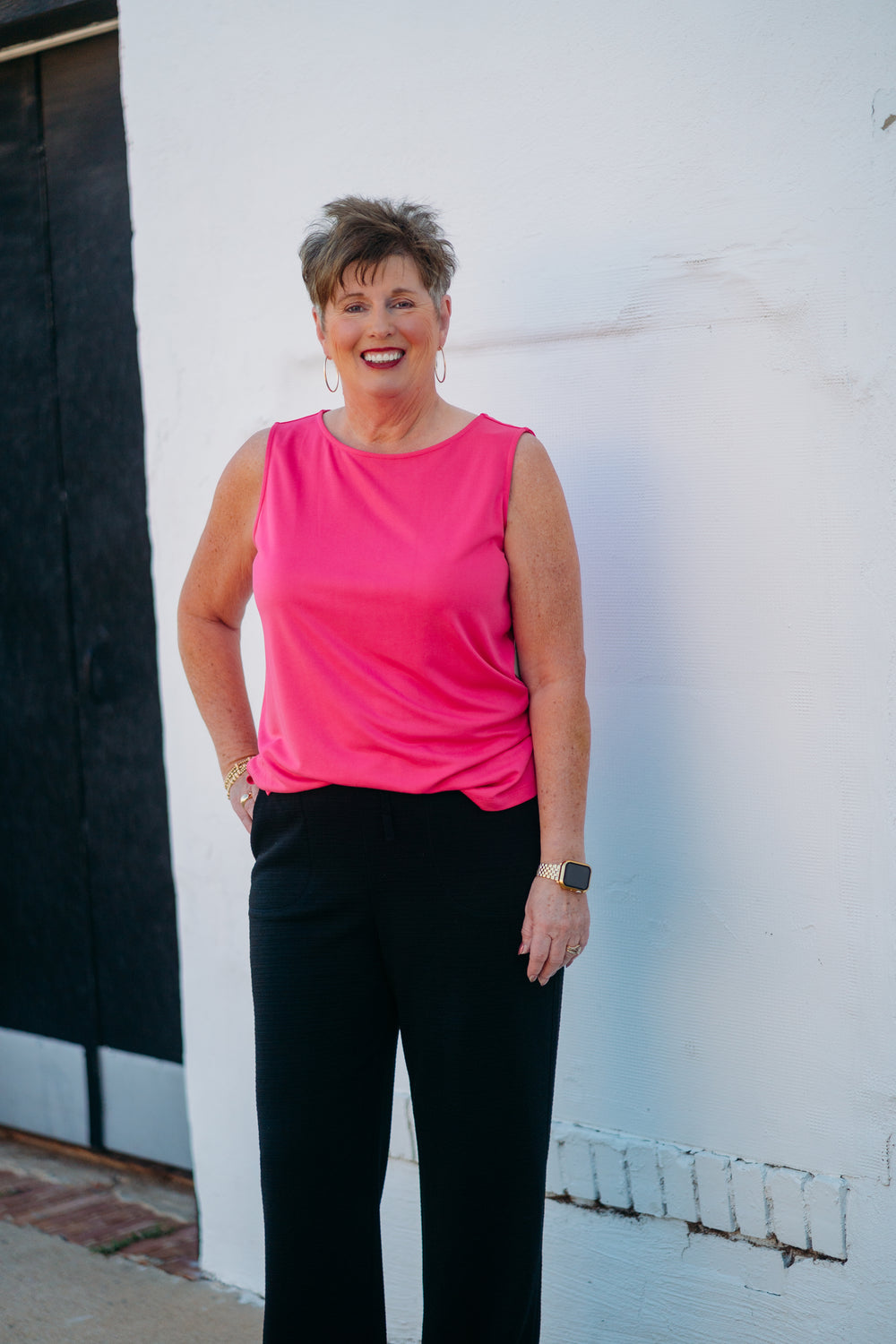 Dress up for the party with Multiples: (Fiesta) Solid Knit Tank Top in Magenta M25103TM! This stylish tank is perfect for any occasion, with its soft knit fabric and vibrant color. Mix and match with any outfit for a fun and playful look. (No boring tanks here!)