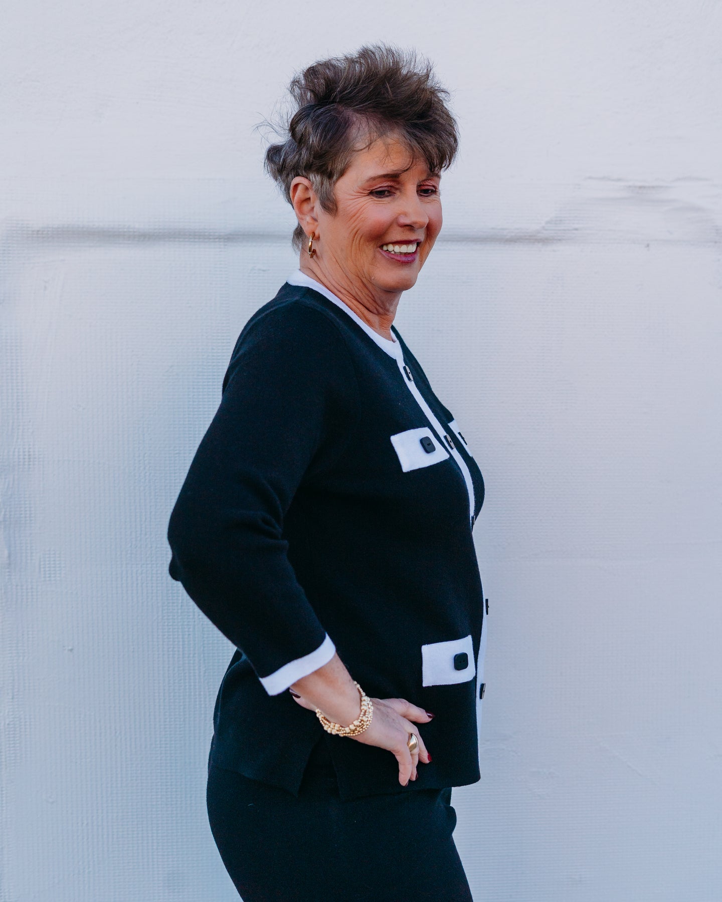 This versatile 3/4 sleeve wide neck sweater combines the elegance of a jacket with the comfort of a knit top. Its faux button front adds a sophisticated touch, perfect for both casual and dressy occasions.