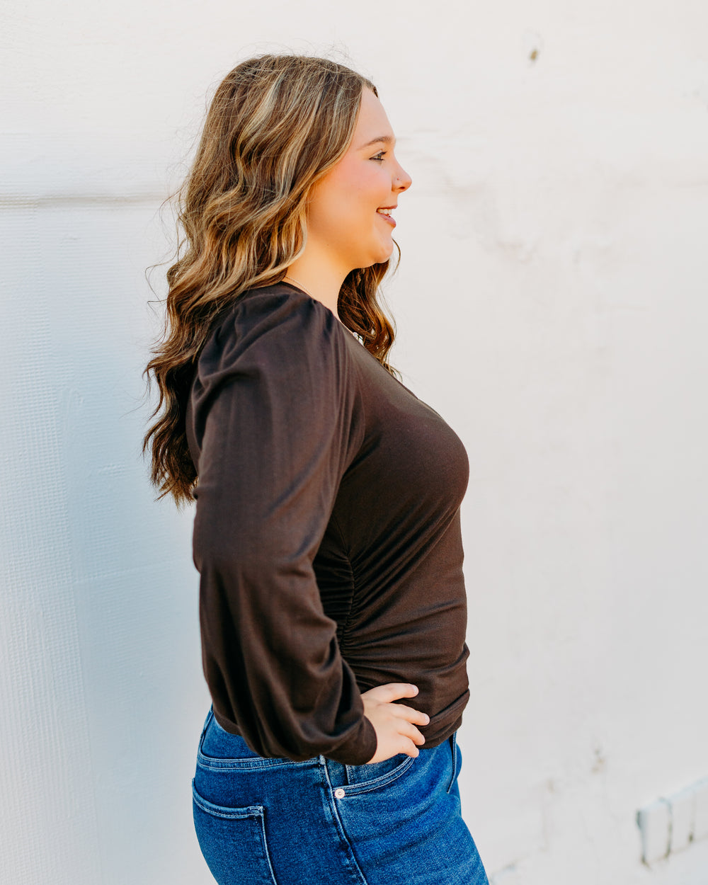 Enhance any wardrobe with the Karen Kane: Shirred V-Neck Top in Brown. Crafted with a fall-inspired palette, this basic fashion piece is perfect for creating versatile layered looks.